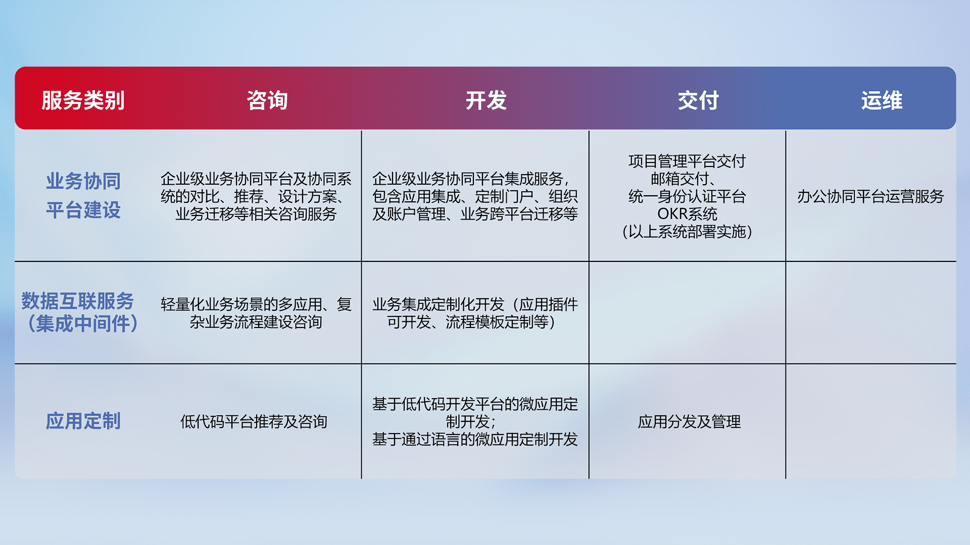 针对钉钉、、、企微、、、、IDaas等平台级产品提供产品的规划、、方案、、交付、、、定制化开发等服务,,实现如统一协同办公、、、智能客户服务、、、、混合会议管理、、智能数据查询、、、等业务场景,,,实现数字化转型。。。