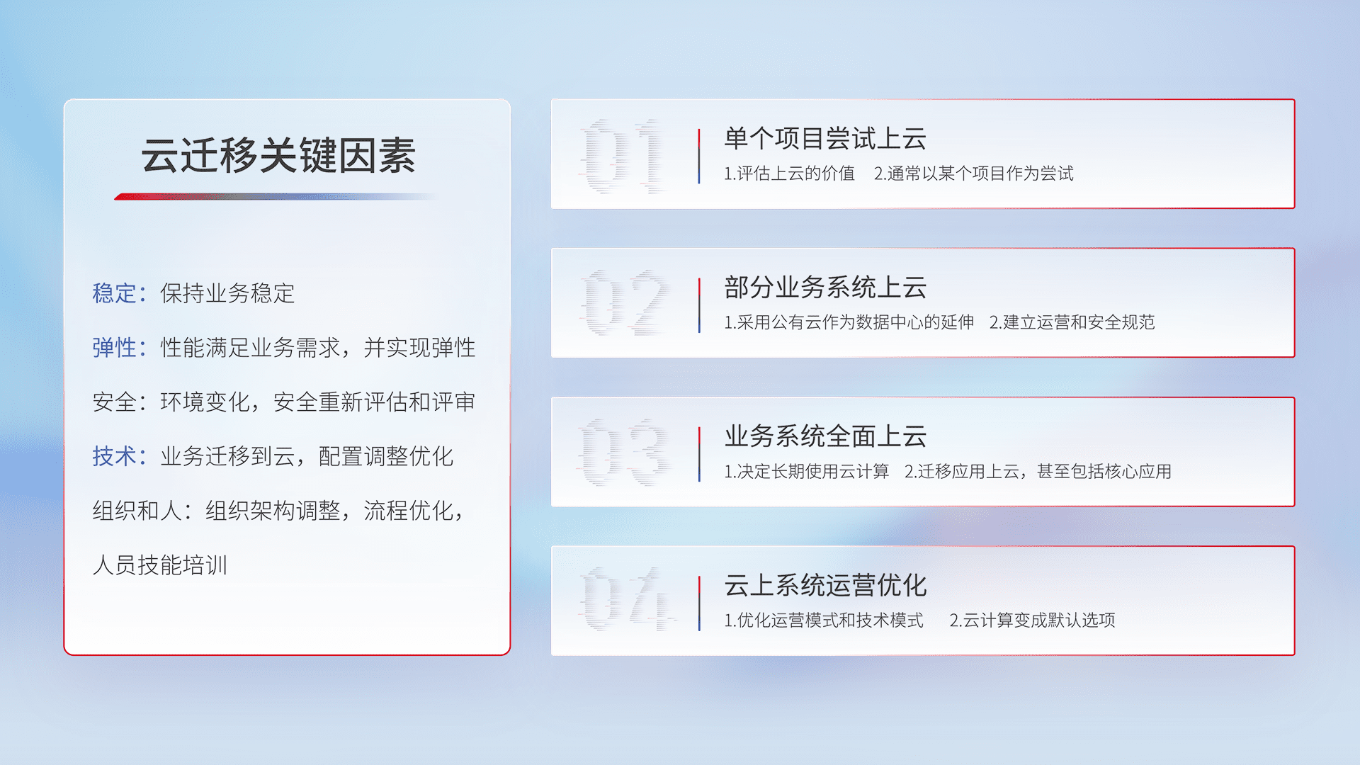 结合实际业务,,,从规划设计、、云平台选型、、、云原生改造、、、、数据迁移、、、集成交付,,,迁移全过程为客户识别最佳上云路径,,做好风险识别管理,,,,设计网络架构、、、、身份权限、、、、安全审计合规、、、操作审计、、、、日志审计、、、、监控告警策略、、、、多站点容灾设计等,,,对云上基础设施进行整体规划,,,,提升IT治理水平,,,以满足弹性、、、高可用、、、高性能的需求。。。
