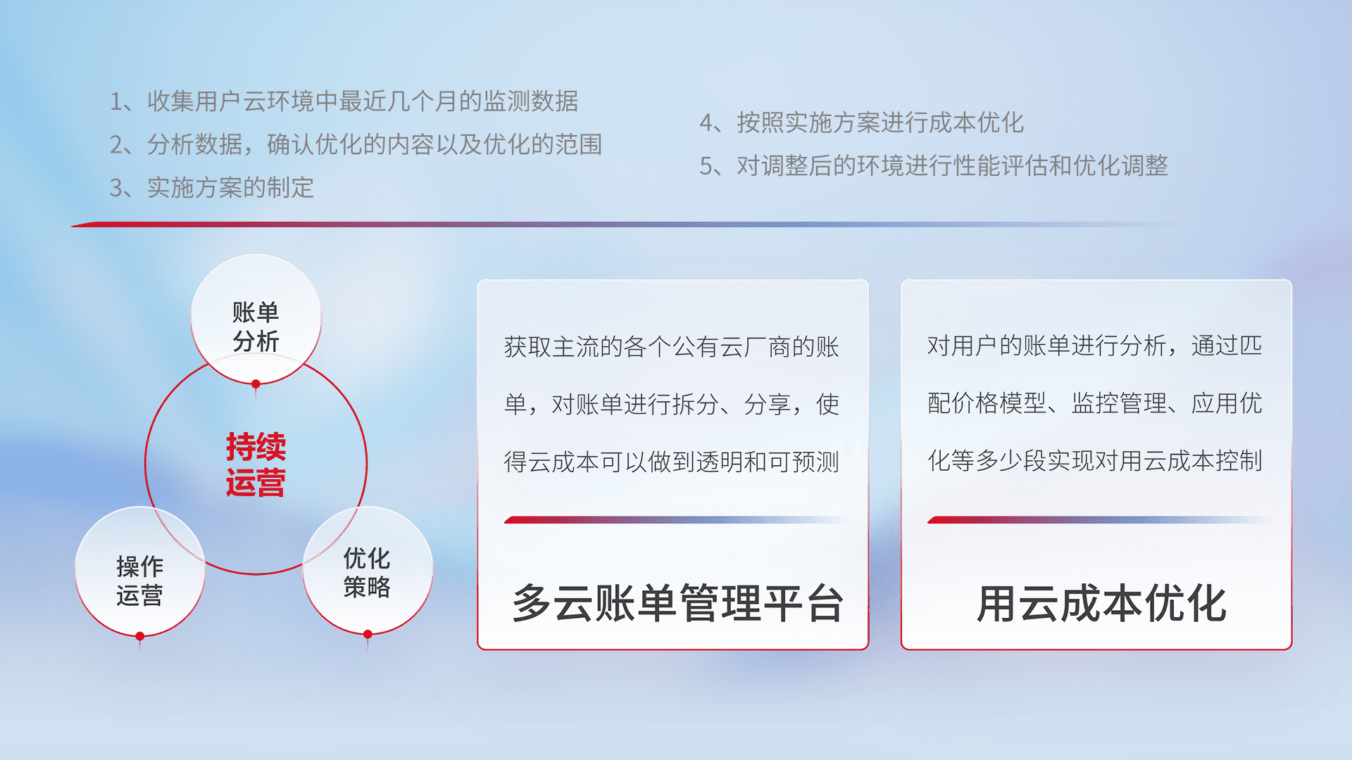 通过多云纳管,,,,以统一的资源数据模型把客户的云资源进行抽象和封装,,进而实现对多云资源的统一操作,,保障云资源管理的可靠性、、、稳定性与可用性。。。。量身定制化运维内容,,,,配置、、开发运维、、、、补丁管理、、、备份、、、监控、、、认证和访问管理、、、、审计和日常巡检等,,保障在用云过程中的可靠度,,,,稳定度以及高可用率。。。